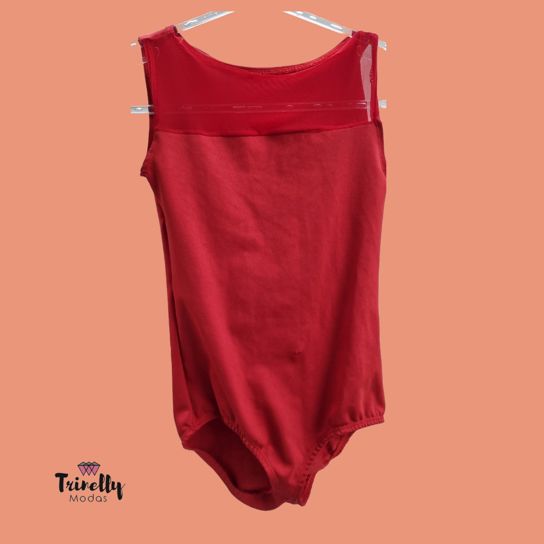 Collant de malha com parte de cima em tela vermelha.